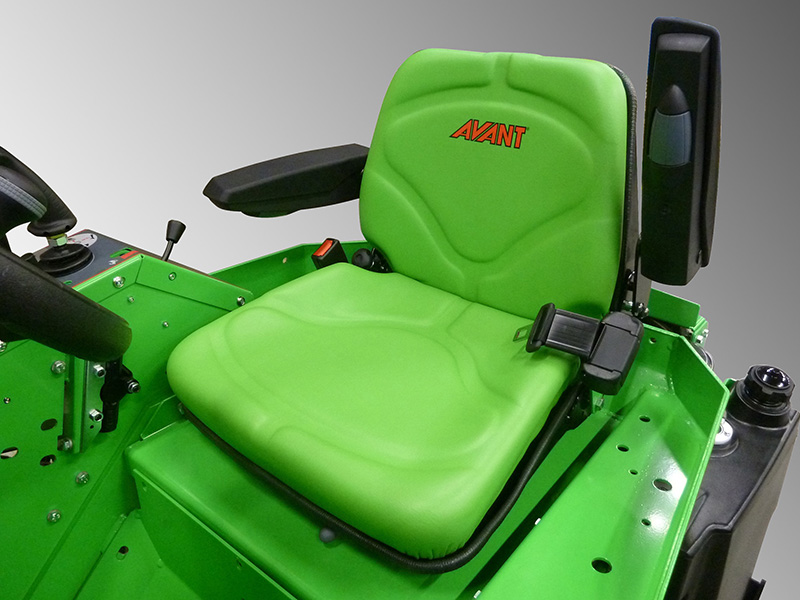 Der gefederte Sitz ist mit Armlehnen, Sicherheitsgurt und Sitzheizung ausgestattet.