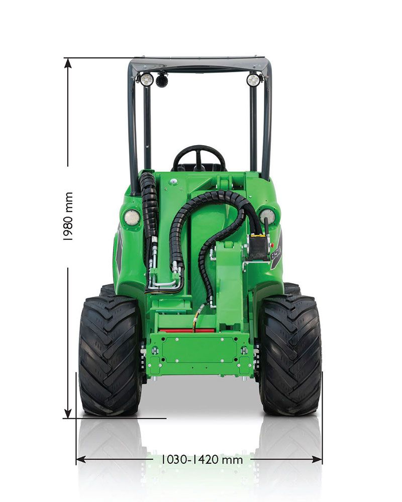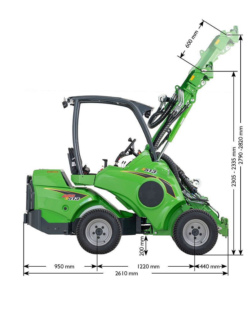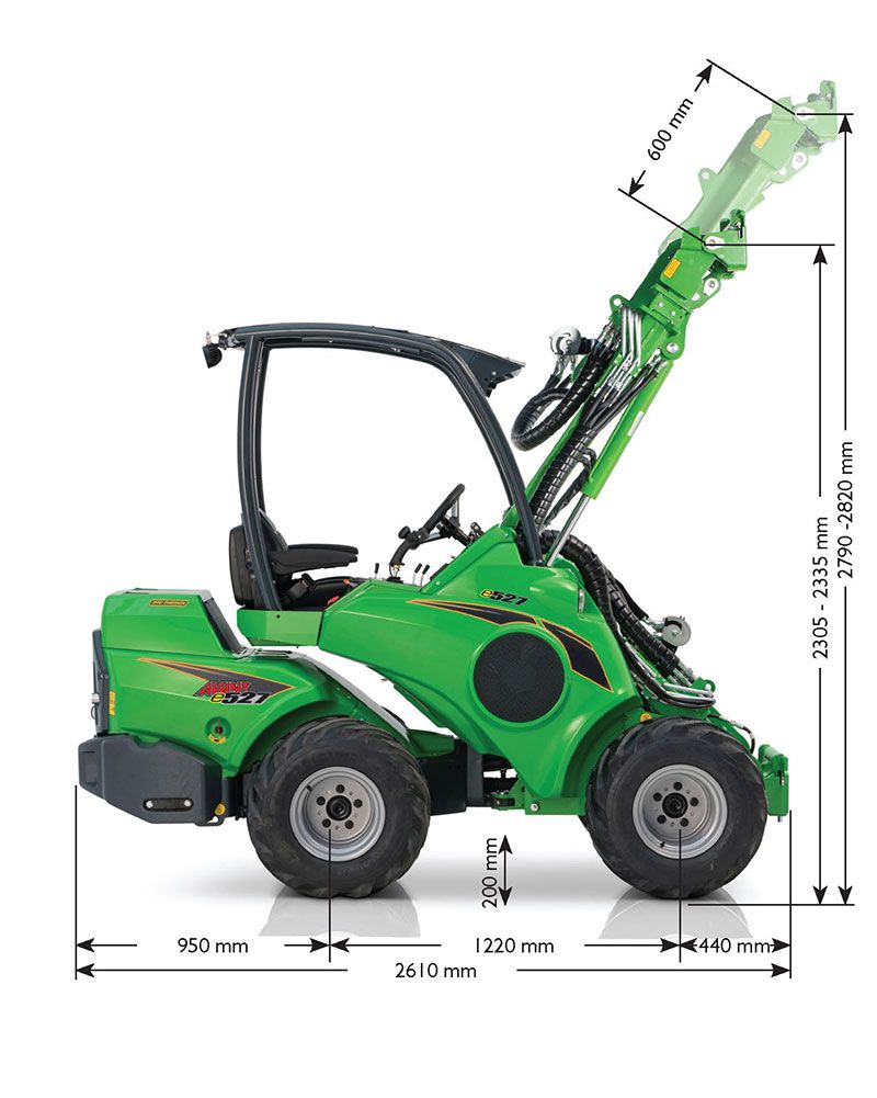 The new fully electric loader models, the Avant e513 and Avant e527, are identical in dimensions. The only difference lies in the capacity and weight of the lithium-ion batteries.