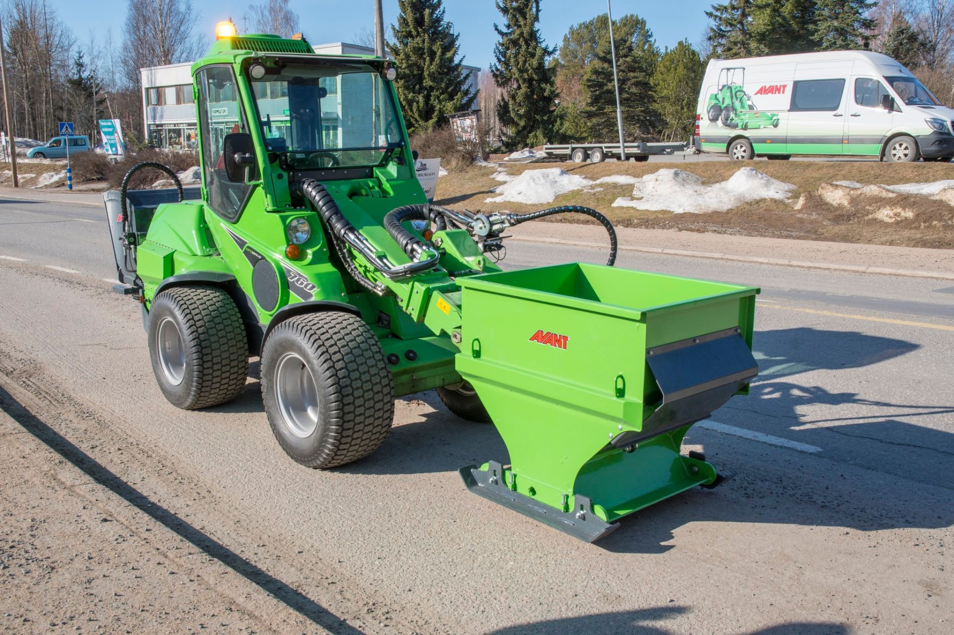 The required aggregate (sand) spreading on asphalt - to make the new asphalt less slippery - can be done at the same time with the rear-mounted Avant sand spreader.